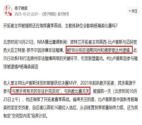 开拓者新赛季首秀刚落下帷幕,上午球员们还在球馆里为输给森林狼懊恼,晚上就传来了炸锅的消息——主教练比卢普斯被FBI带走了。