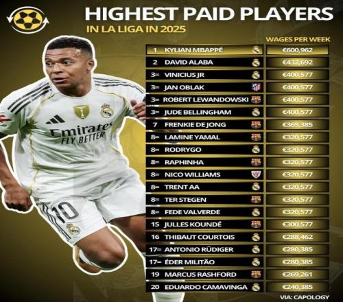 西甲球员工资排名前二十曝光!皇马11人巴萨7人!姆巴佩每周469万